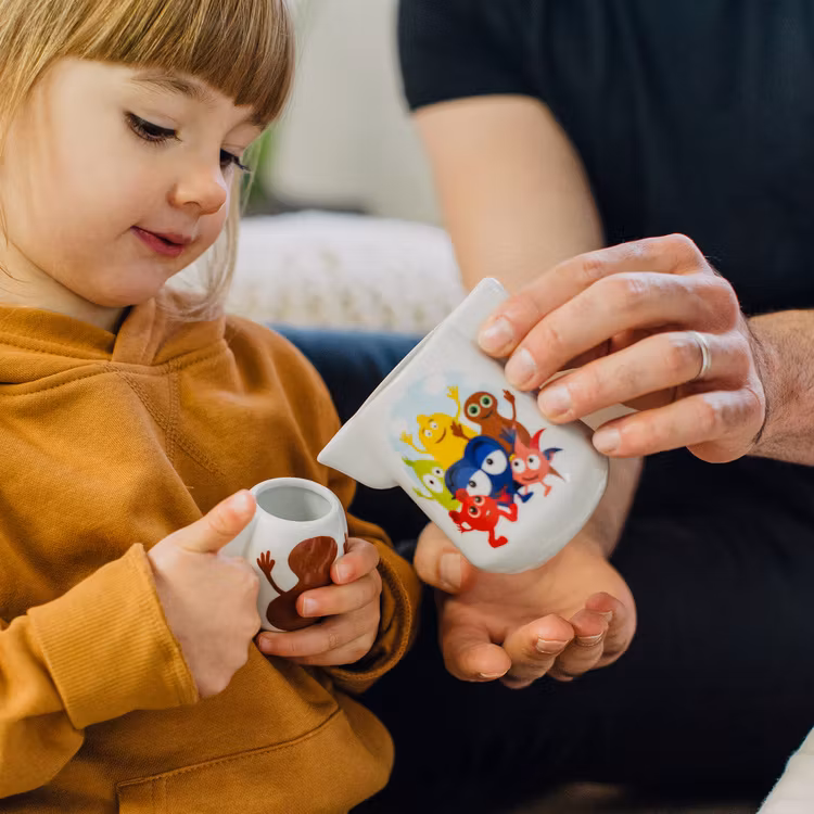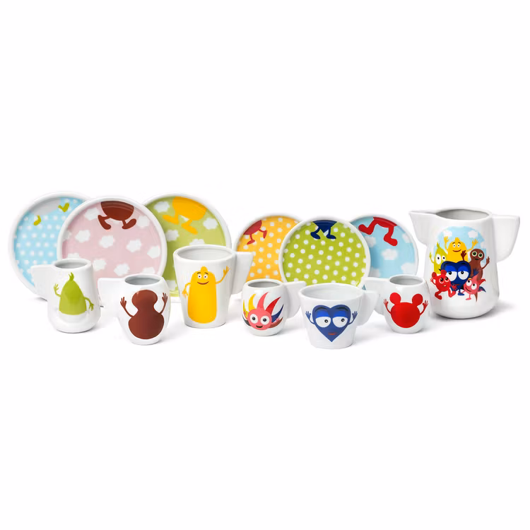 Duka upp till kalas med Babblarna! I denna färgglada leksaksservis av porslin ingår sex koppar, sex fat och en kanna. Varje kopp har formen efter den figur som finns på koppen. Vad bjuder du på idag? Saft, kaffe eller kanske varm choklad? När barn babblar, pratar, sjunger och leker tillsammans med Babblarna, utvecklar de samtidigt sitt eget tal och språk. Babblarnas leksaksservis tål maskindisk. Kalaset blir komplett med den matchande Babblarna-tårtan i trä.